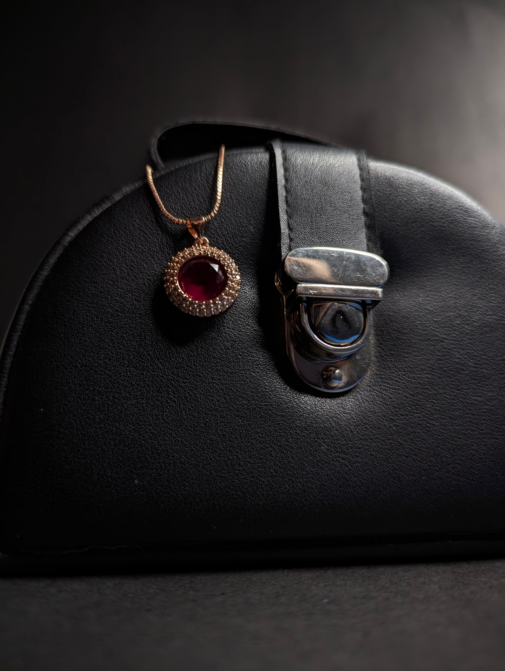 •Deep crimson crystal centerpiece surrounded by sparkling accents that shine from every angle.